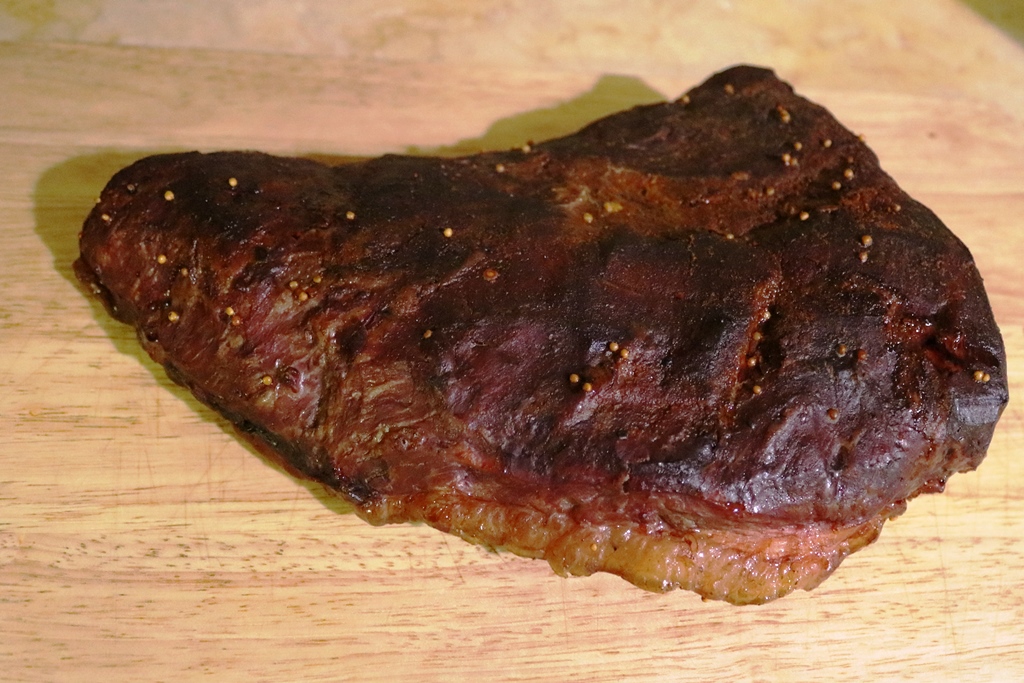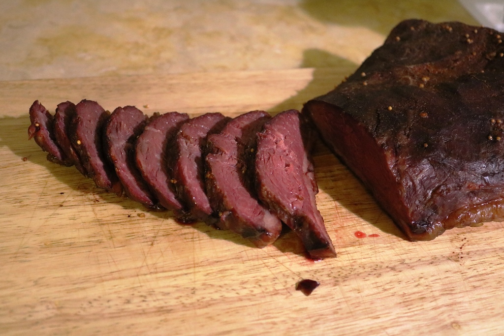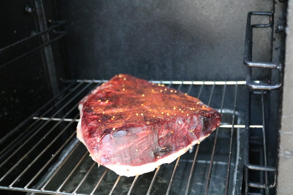 הצורה של השפיץ צ'ך יותר אחידה ולכן הפחת קטן משמעותית מאשר בשפיץ שייטל. אבל הצבע, המרקם והריח זהים ונפלאים. מרחתי את הנתח בנגיעה קטנה של שומן ברווז כדי שתבלין הקייג'ון יידבק והכנסתי אותו למעשנה על חום של 100-110 עם צ'אנקים של חביות יין.