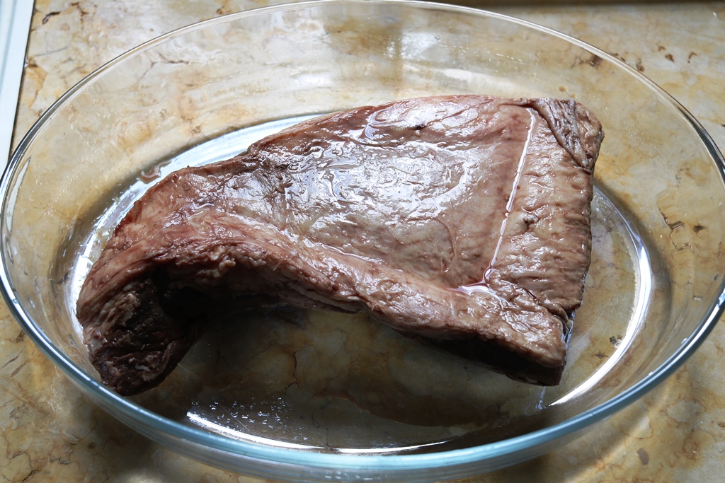 שפיץ שייטל משויש במשקל 1.5 קילו נח לו יממה במקרר עם מעט מלח.