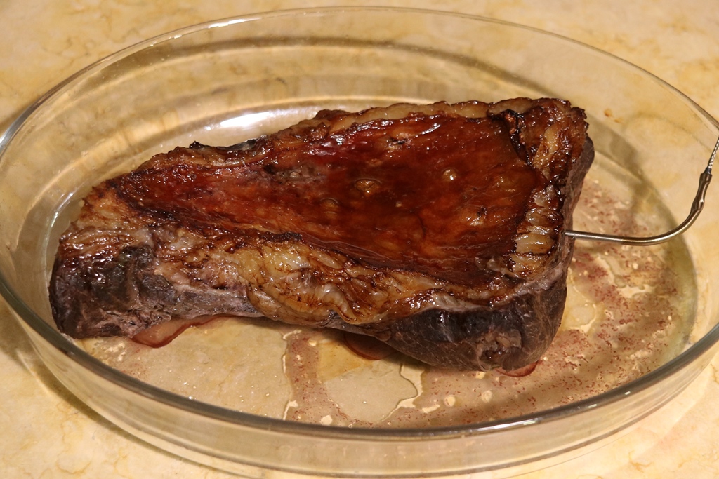 פרוב טמפרטורה הוכנס לנתח, הנתח הוכנס לתבנית זכוכית, תבנית הזכוכית הוכנסה לחלק העליון של התנור בטמפרטורה של 125 מעלות.