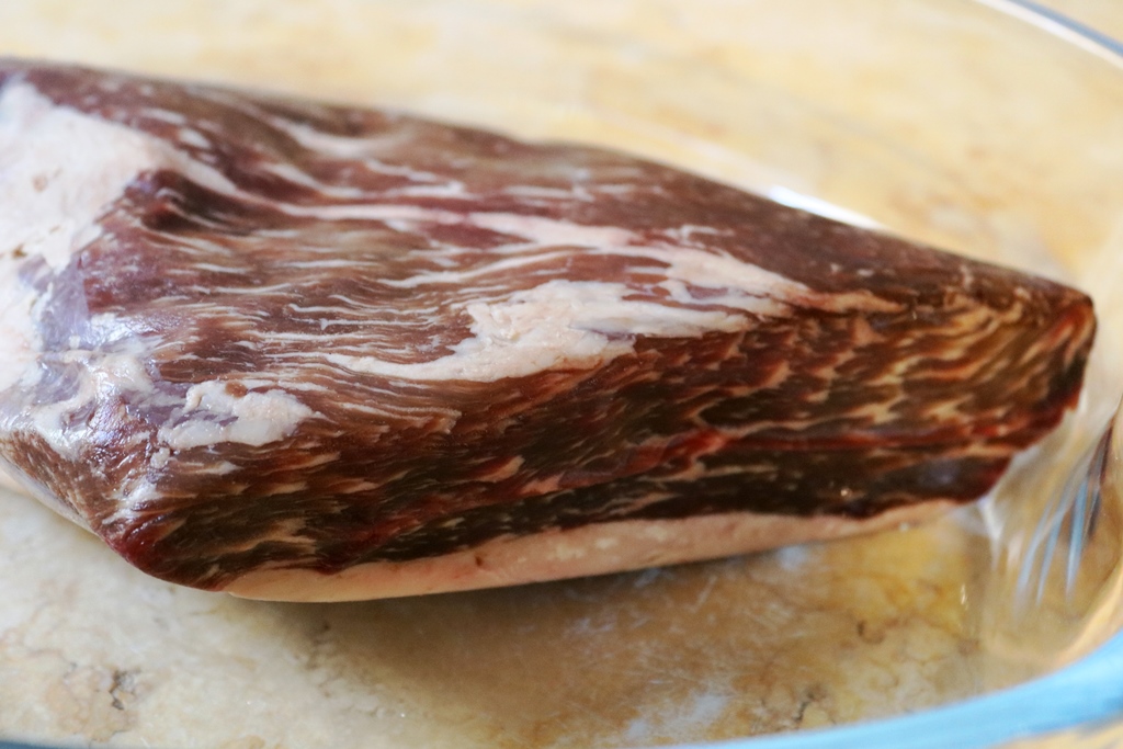 אפשר לראות שהנתח נשאר כמעט באותו גודל ורק כמות מזערית של נוזלים נזלו לתבנית המים – בשר נטו.