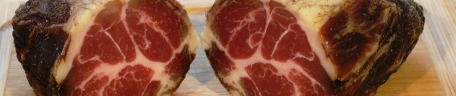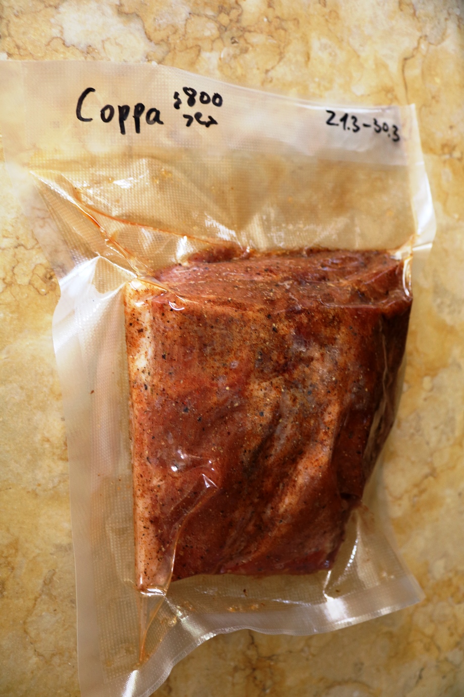 לתלוי השני שלי בחרתי בקלאסיקה איטלקית, לא מפורסמת כמו Prosciutto, Pancetta או Bresaola, ועונה לשם Coppa או Capocollo וגם Capicola. הבשר הפעם הוא צוואר חזיר ולקחתי את המתכון כלשונו מתוך הספר שרכשתי. השינוי היחיד שעשיתי הוא שימוש במלח כבישה #1 ולא #2. מכיוון שאין לי כוונות להחזיק את המוצר חודשים רבים (או שנים), אין בכך להבנתי כל סיכון.