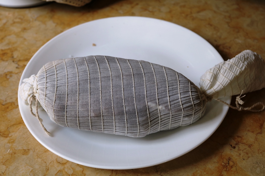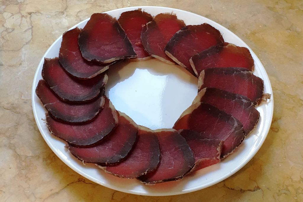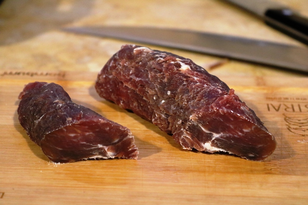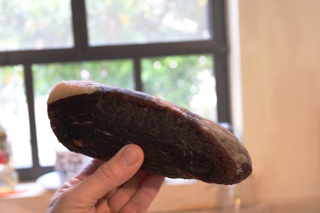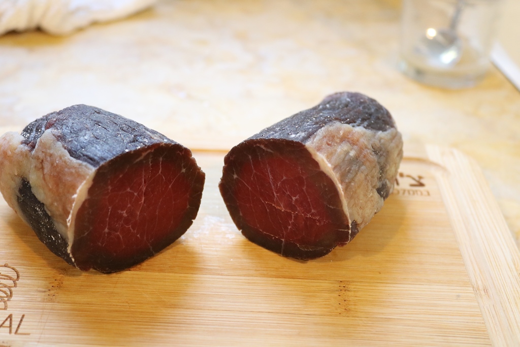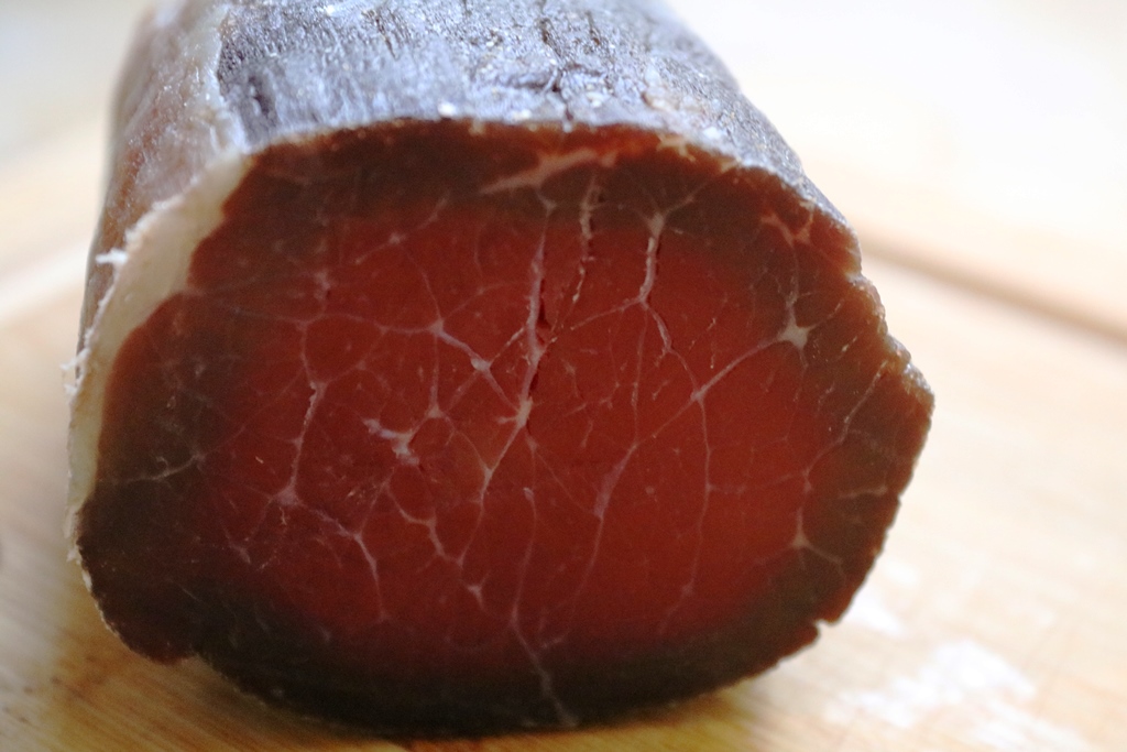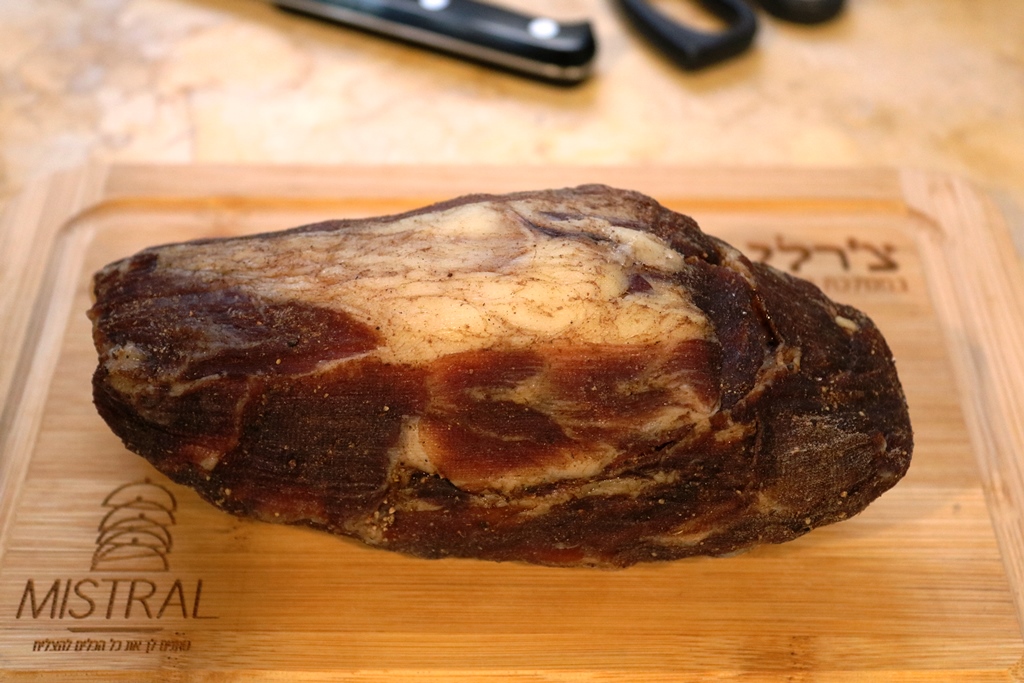 הבשר היה תלוי למשך 3 שבועות ואיבד 31% ממשקלו. הקליפה התייבשה והתקשתה באופן משמעותי אבל החלק הפנימי נשאר רך וריחני, ובמרקם אחיד.