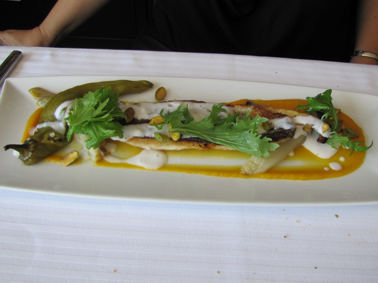 הילה בחרה באס-מפוספס ביוגורט חם – פילה דג באס צרוב על פלאנצ'ה, עם קרם שומר עדין, פטריית מלך ופיסטוקים. הוזהרנו שהפלפל המונח בצד אכן חריף אבל למרות הכחשות הצוות גם הרוטב הצהוב סבל מחריפות גבוהה ולכן למרות שהבאס היה טעים, הוא אכן היה מפוספס, להילה לא הייתה שום בעיה לחזור לאויסטרים הישנים והטובים.