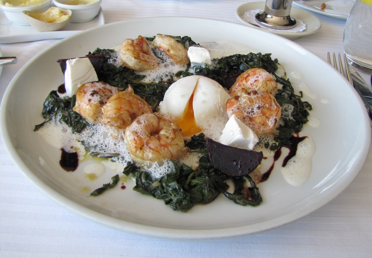 לעיקרית בחרתי בשרימפ פופאי – חסילונים צרובים על תרד תורכי, גבינת פטה וביצה עלומה ברוטב יין אדום וקציפת ליים-טימין. המלצרית הזהירה שזו מנה עם המון טעמים, אבל כל עוד הם לא כוללים חריף אין לי בעיה.